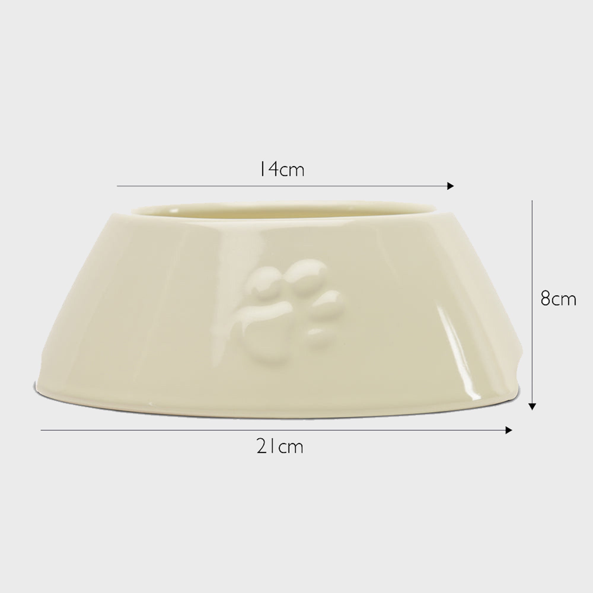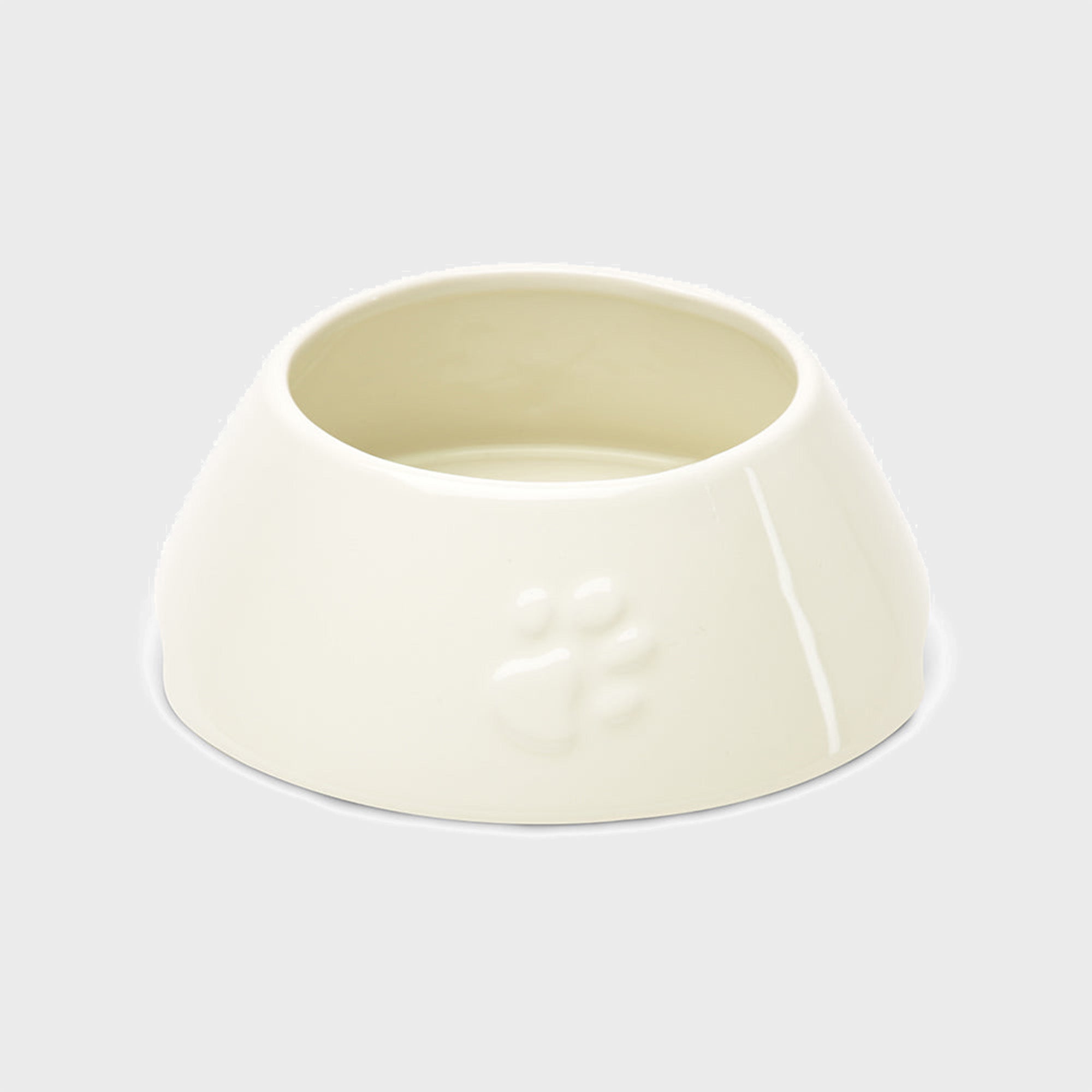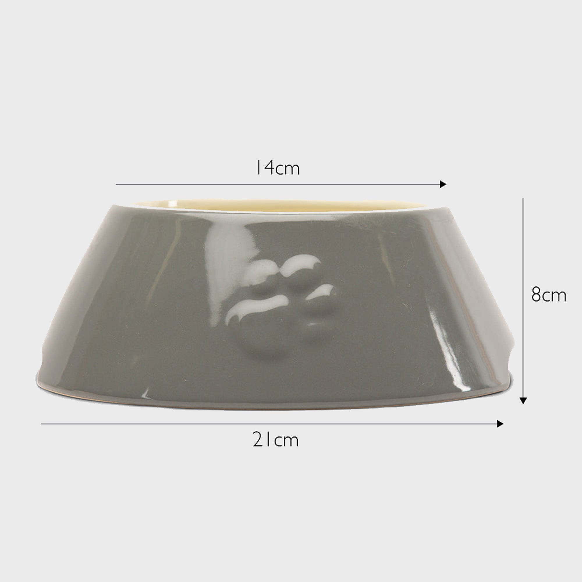 Made from heavy stoneware ceramic it's designed to help prevent dogs from moving the bowl around when eating or drinking. It also features an ergonomic finger hold for easier serving and lifting.