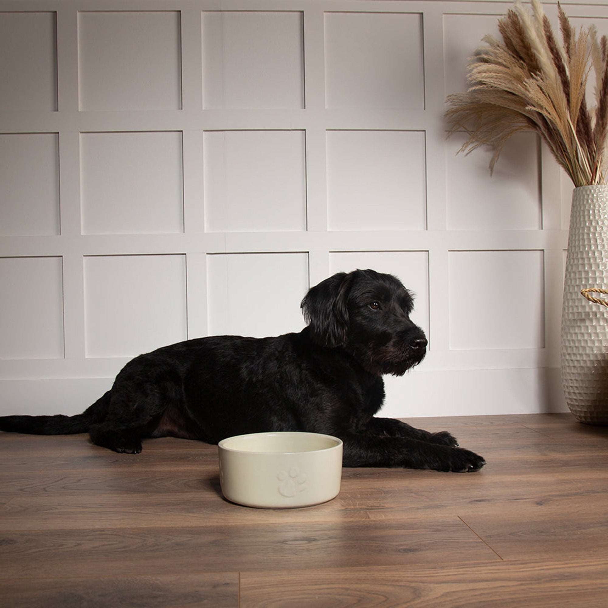 Made from heavy stoneware ceramic it's designed to help prevent dogs from moving the bowl around when eating. It also features an ergonomic finger hold for easier serving and lifting.