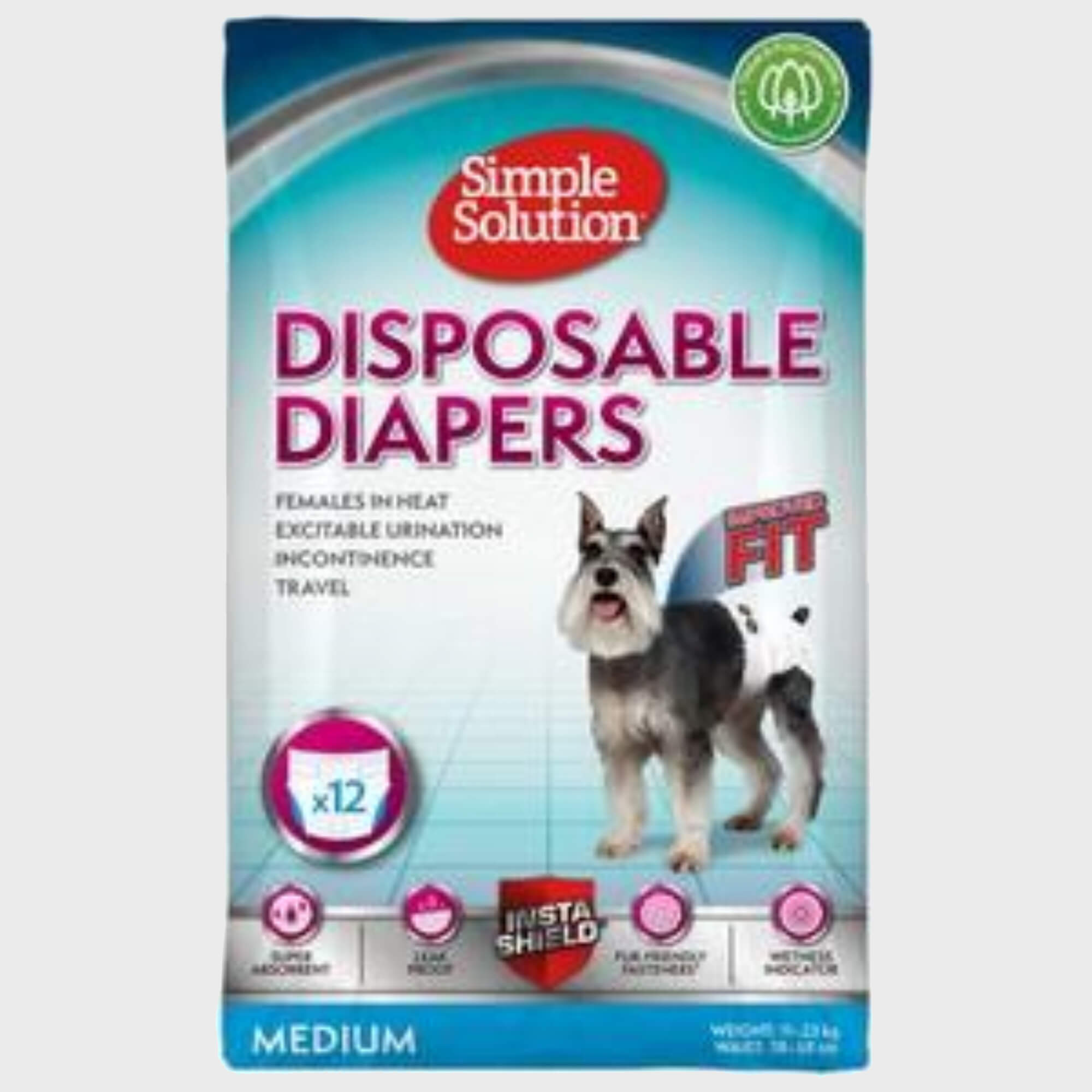 Redesigned with a way better fit than our previous diapers, Simple Solution Disposable Dog Diapers protect your home and give you peace of mind. Fur-Friendly Fasteners, leak-proof barriers, and a super absorbent core mean comfort for your pet and no pee on the floor. The wetness indicator will let you know when it's time to change the diaper. And they come in new adjustable sizes that aren't just a close fit, they're a perfect fit.