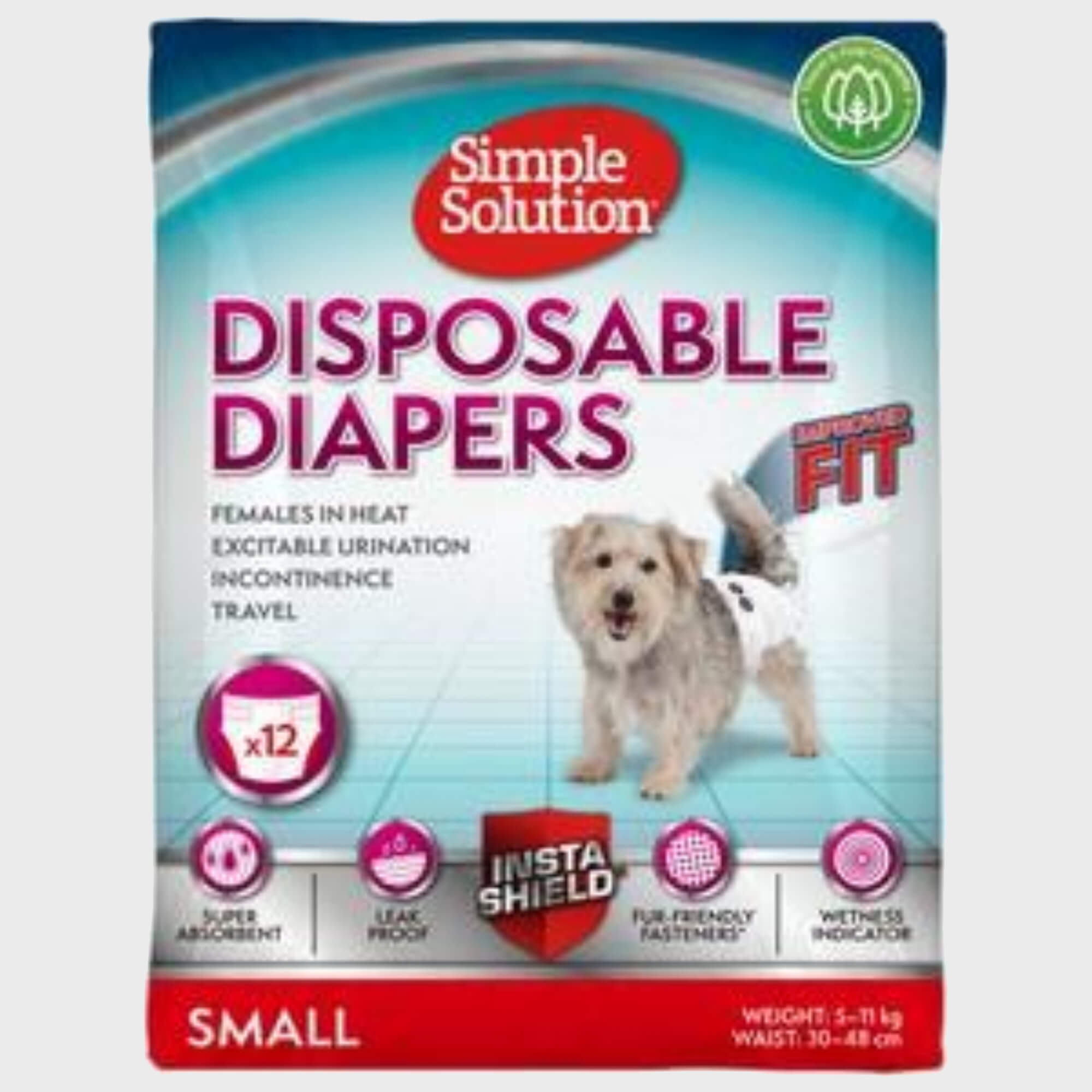- A BETTER FIT - Simple Solution Small Disposable Dog Diapers with new adjustable fit sizes are for female dogs with a 12-19 inch waist. These female dog diapers feature a stretchable fabric that fits snugly around your pet.