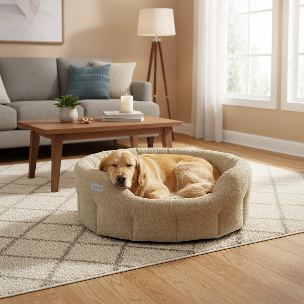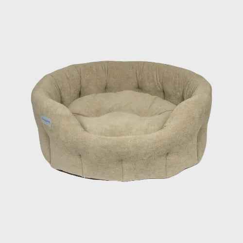 Our Round Dog Bed in the Devon fabric is crafted from a plush knitted upholstery grade material, woven to create an irresistibly soft surface that wraps your dog in warmth and comfort. Inspired by the peaceful dog loved beaches of Devon, this fabric is as gentle as sand underfoot yet as resilient as the coastal landscape that surrounds it. Its earthy natural tones bring a sense of calm and a touch of the outdoors into your home.