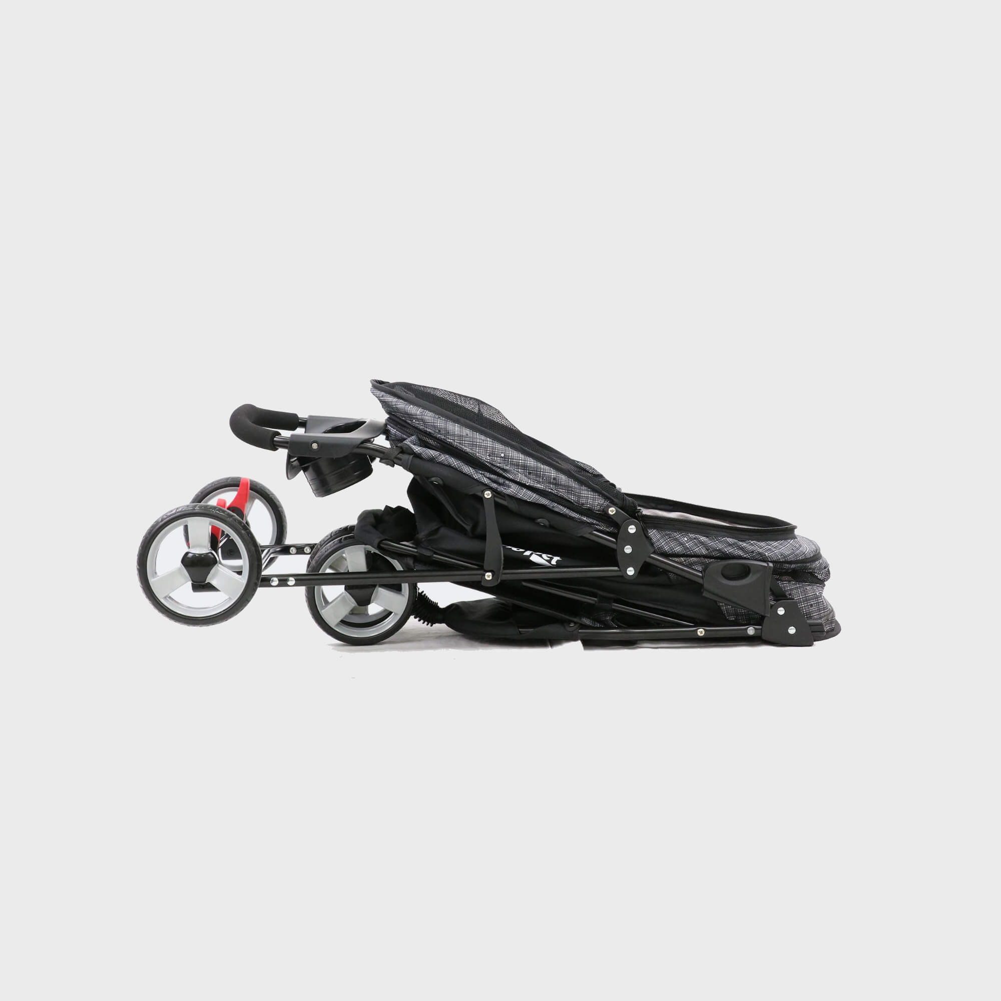 Enjoy a smoother stroll with shock-absorbing front wheels that swivel on flat surfaces or lock on rougher ground. The canopy folds away into the hood, maximising cabin space, while the 97cm reach handle gives more walking clearance for a natural stride. Plus, it folds flat in seconds for quick storage.
