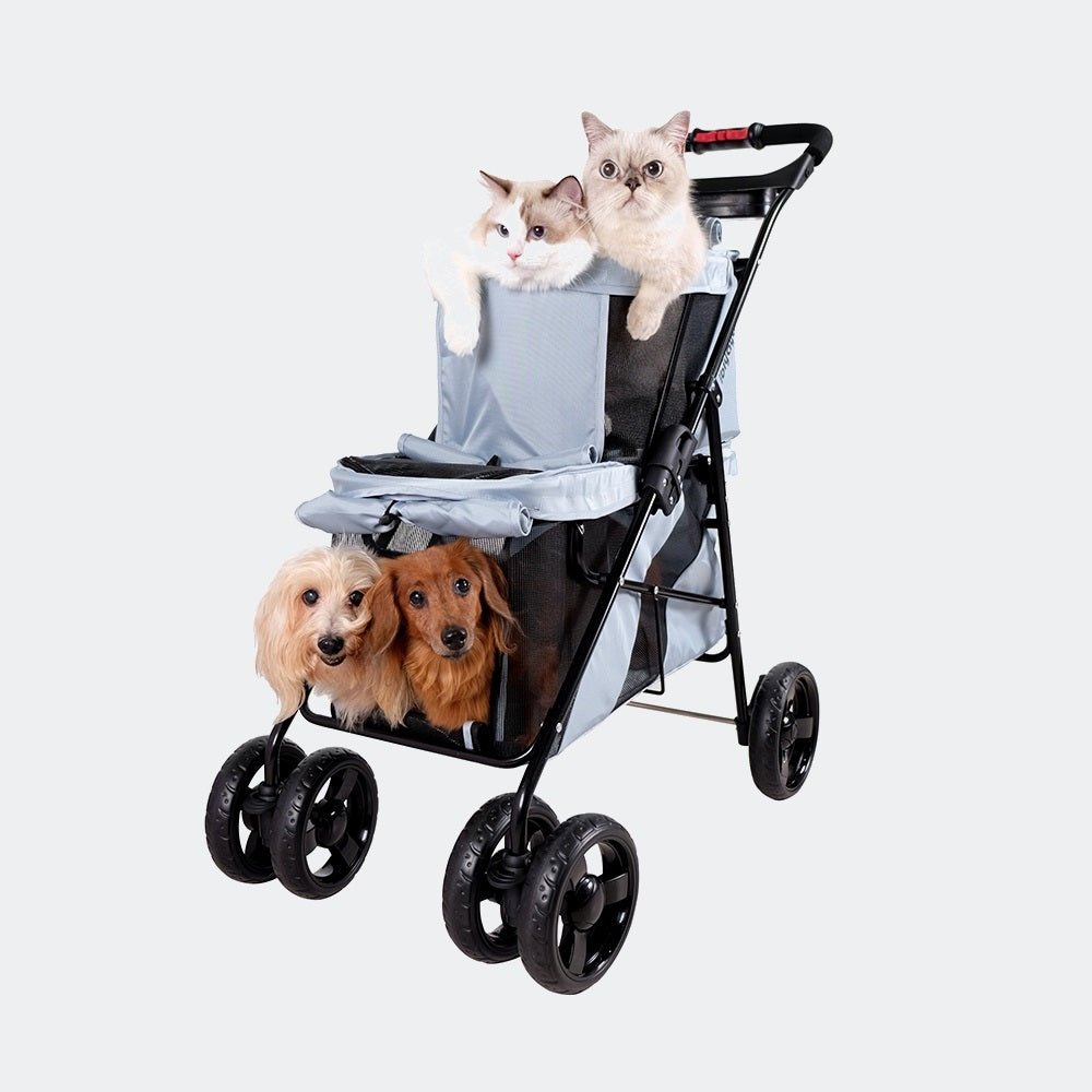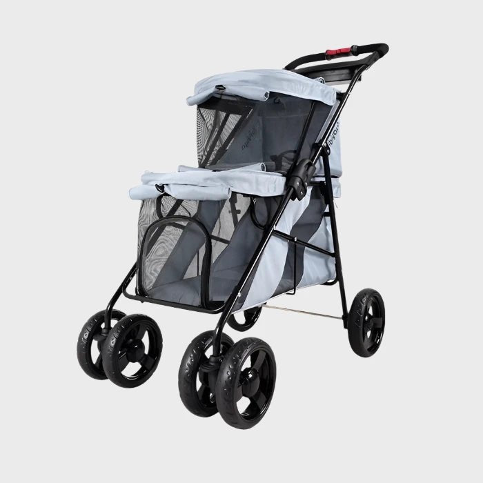 Double the space. Double the comfort. The perfect stroller for pets who love to ride together.