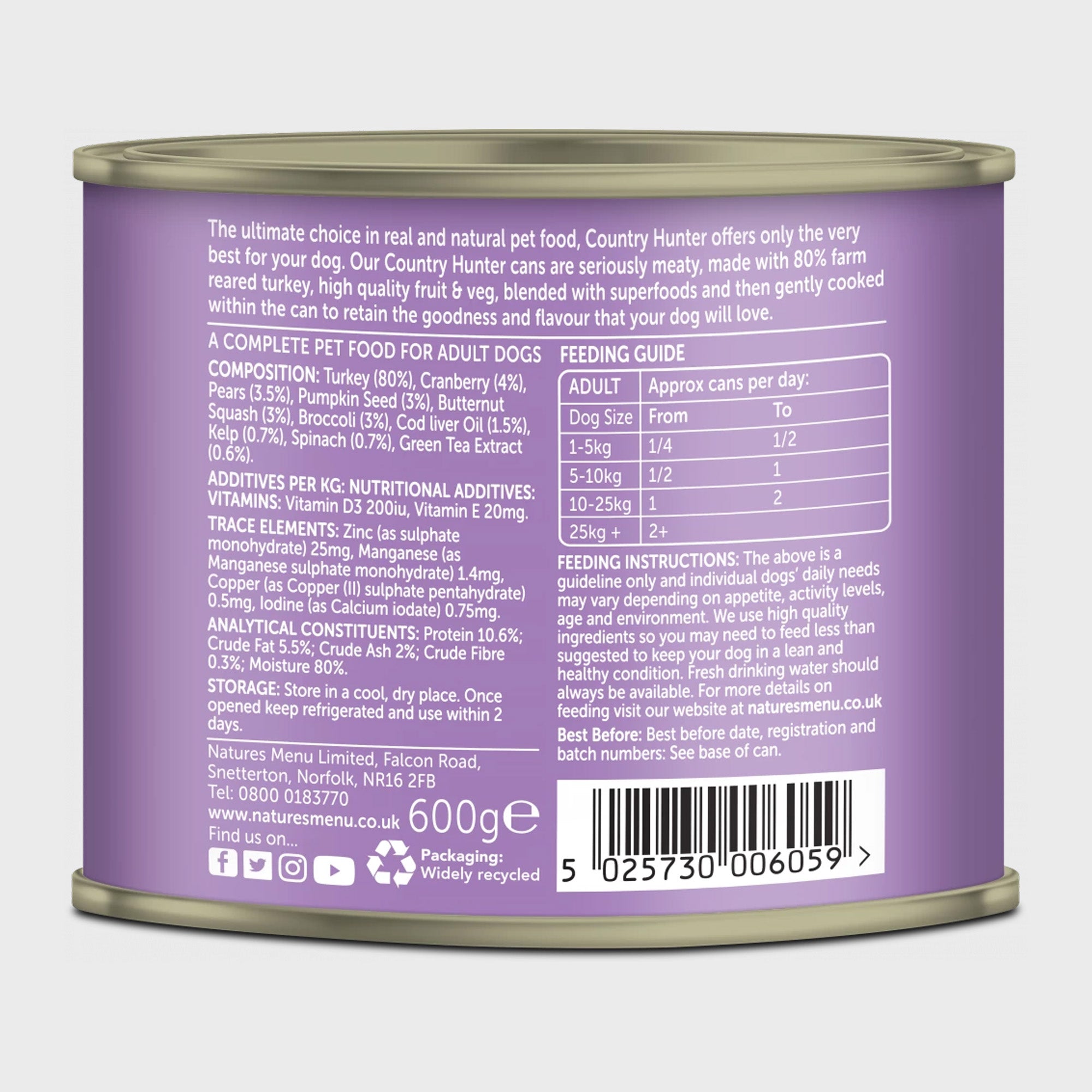 This seriously meaty, complete and balanced meal is made with 80% high quality, farm-reared turkey blended with fruit and vegetable superfoods, including cranberries, butternut squash, broccoli and pears. All gently cooked inside the can to lock in the goodness and flavour that your dog will love.