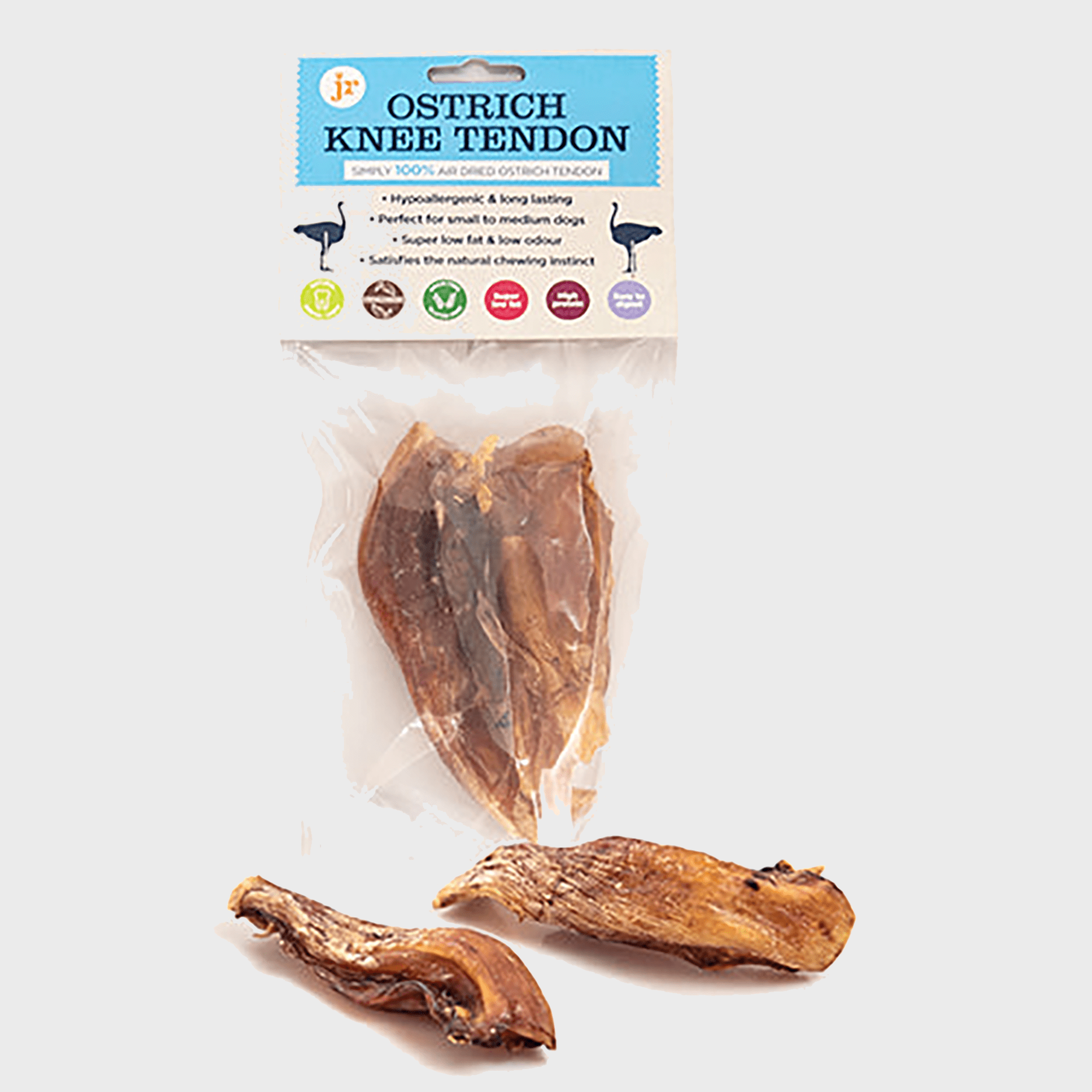 Our new Ostrich knee tendons are made with 100% Knee tendon, these chunky chewy tendons are perfect for small to medium sized dogs with an appetite to chew.