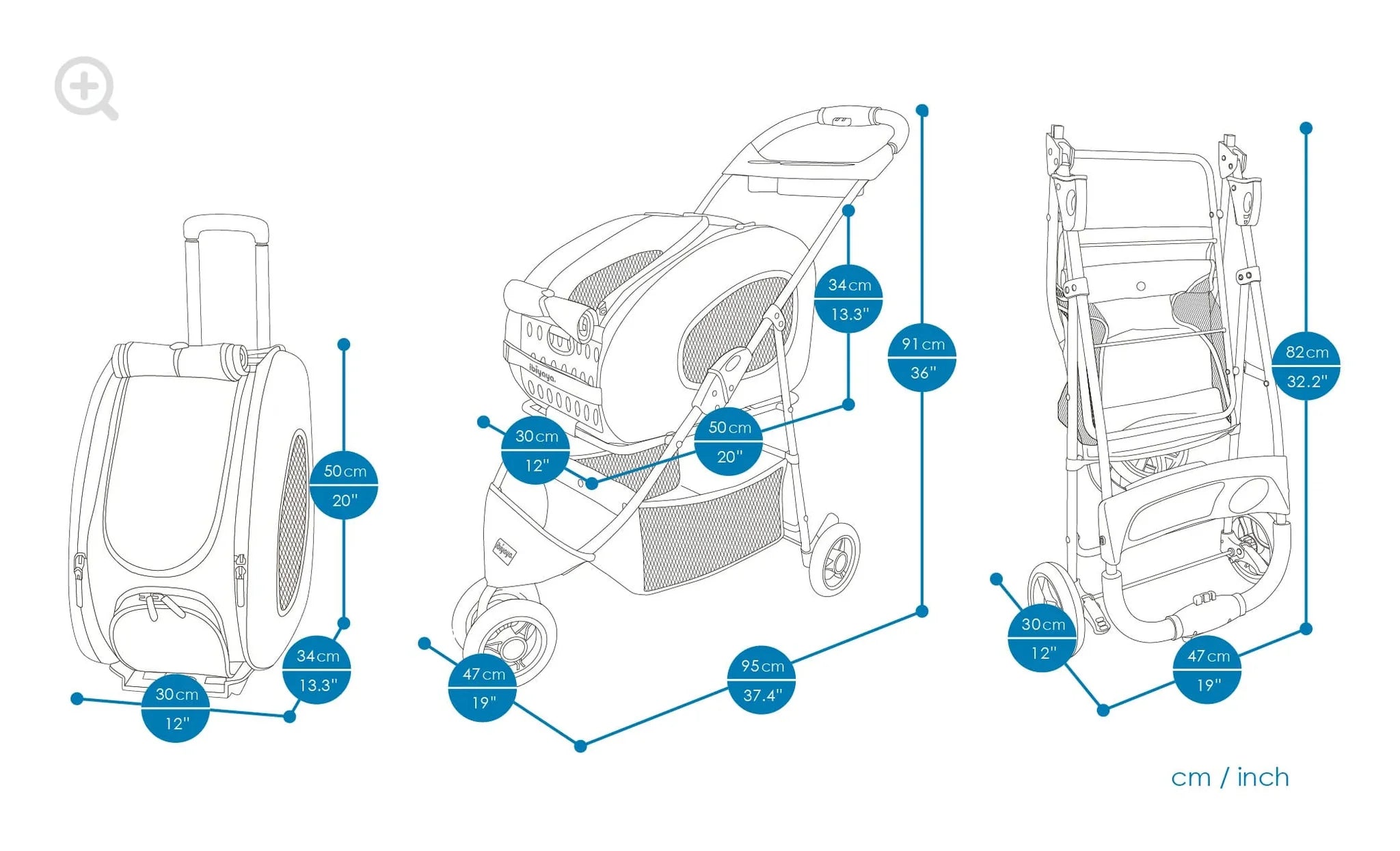 • Stroller (open): L91 x W95 x H47 cm (L36 x W37.4 x H19 in)