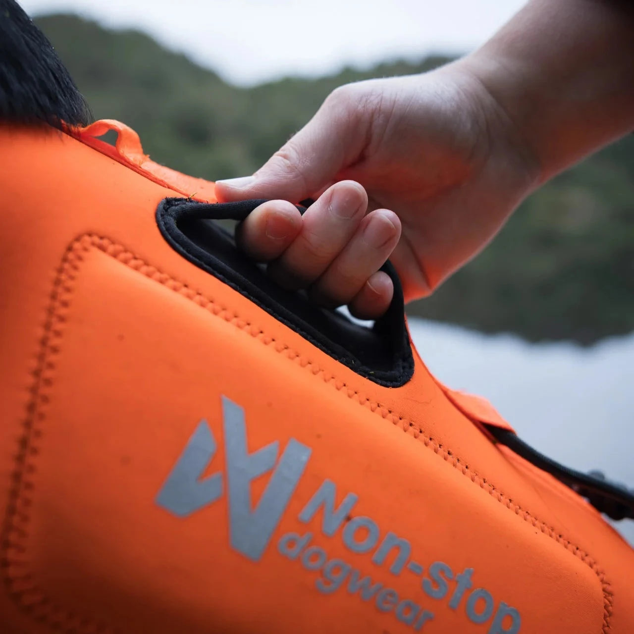 The low-profile handle stays flat when not in use to avoid snags, and offers a reliable grip when lifting your dog into a boat. Neoprene buoyancy and side foam panels provide added water support without restricting agility on land.