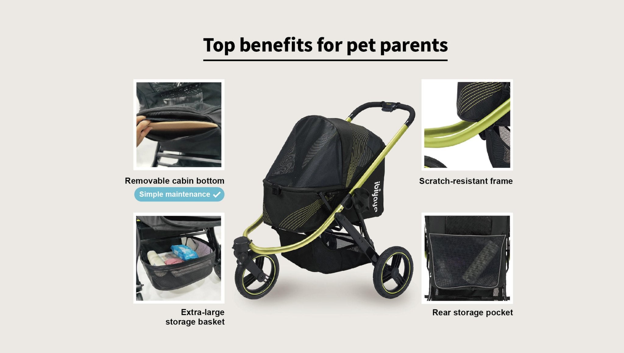 Take your furry friend on the run with The Beast Dog Jogging Stroller. Designed for medium-sized dogs or two smaller companions, this stroller offers the ideal combination of comfort, control and certified safety. With three large wheels that handle all terrains with ease, your dog will enjoy every outing while you enjoy a stable, effortless push.