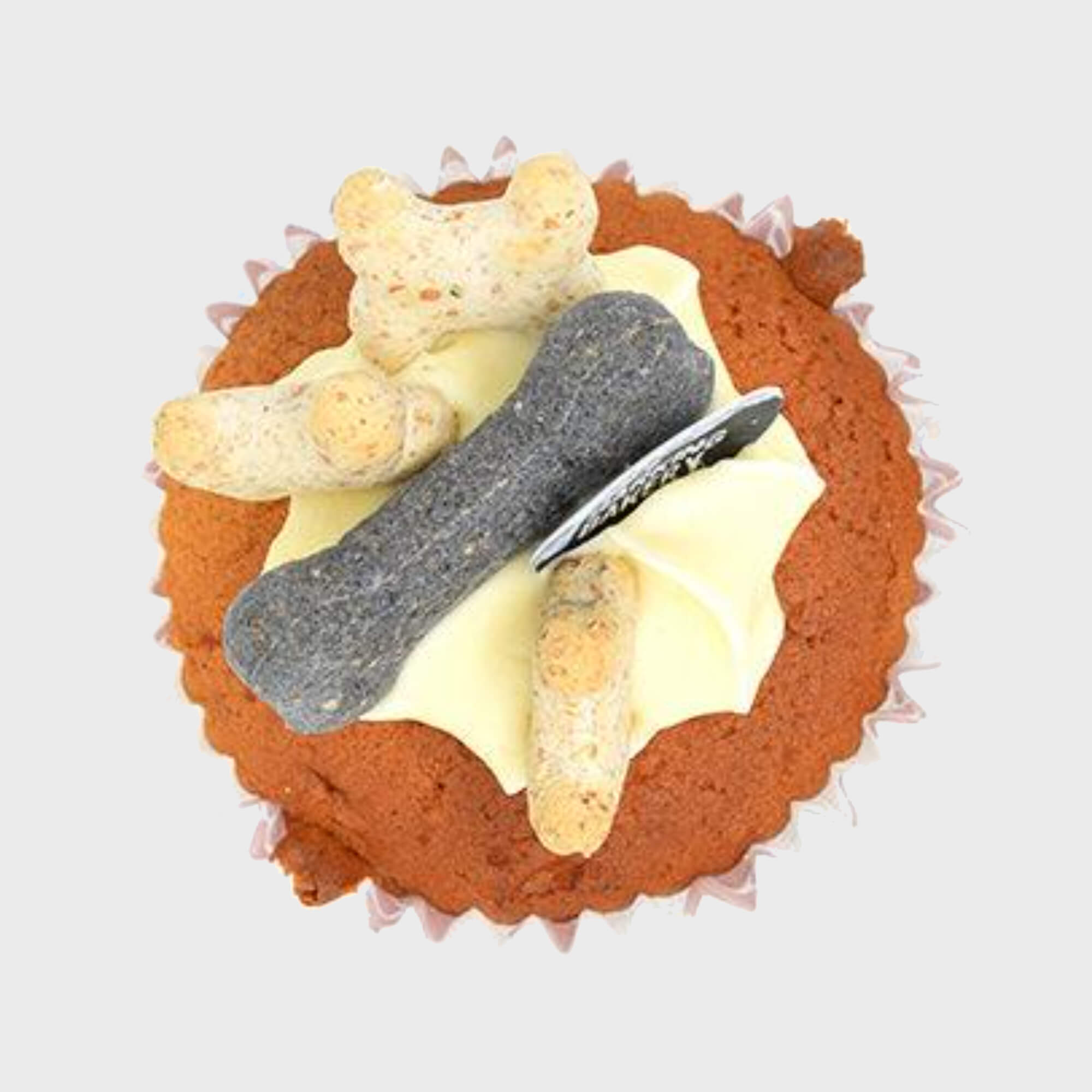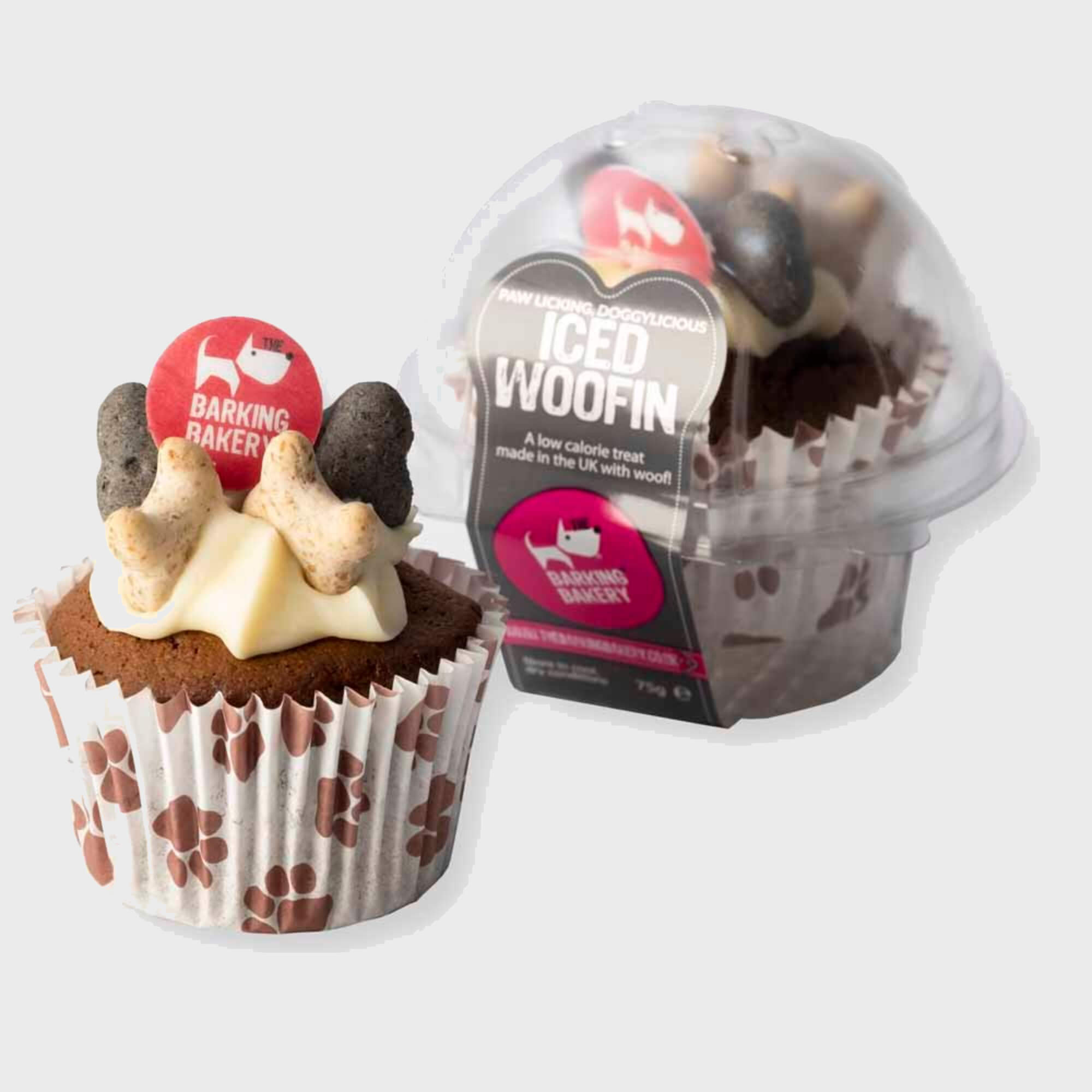 A single Vanilla Iced Vanilla Woofin doggy cupcake treat. Something really pawsome, made to share or for the larger of our furry friends... our light sponge, topped with a tail-swishing swirl of famous yoghurt frosting and decorated with crunchy dog bone biscuit and edible disc in a paw print muffin wrapper.