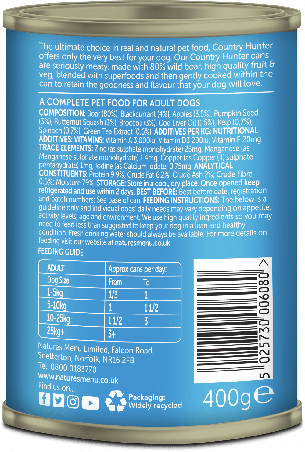 This seriously meaty, complete and balanced meal is made with 80% wild boar blended with fruit and vegetable superfoods, including blackcurrants, butternut squash, apples and broccoli. All gently cooked inside the can to lock in the goodness and flavour that your dog will love.