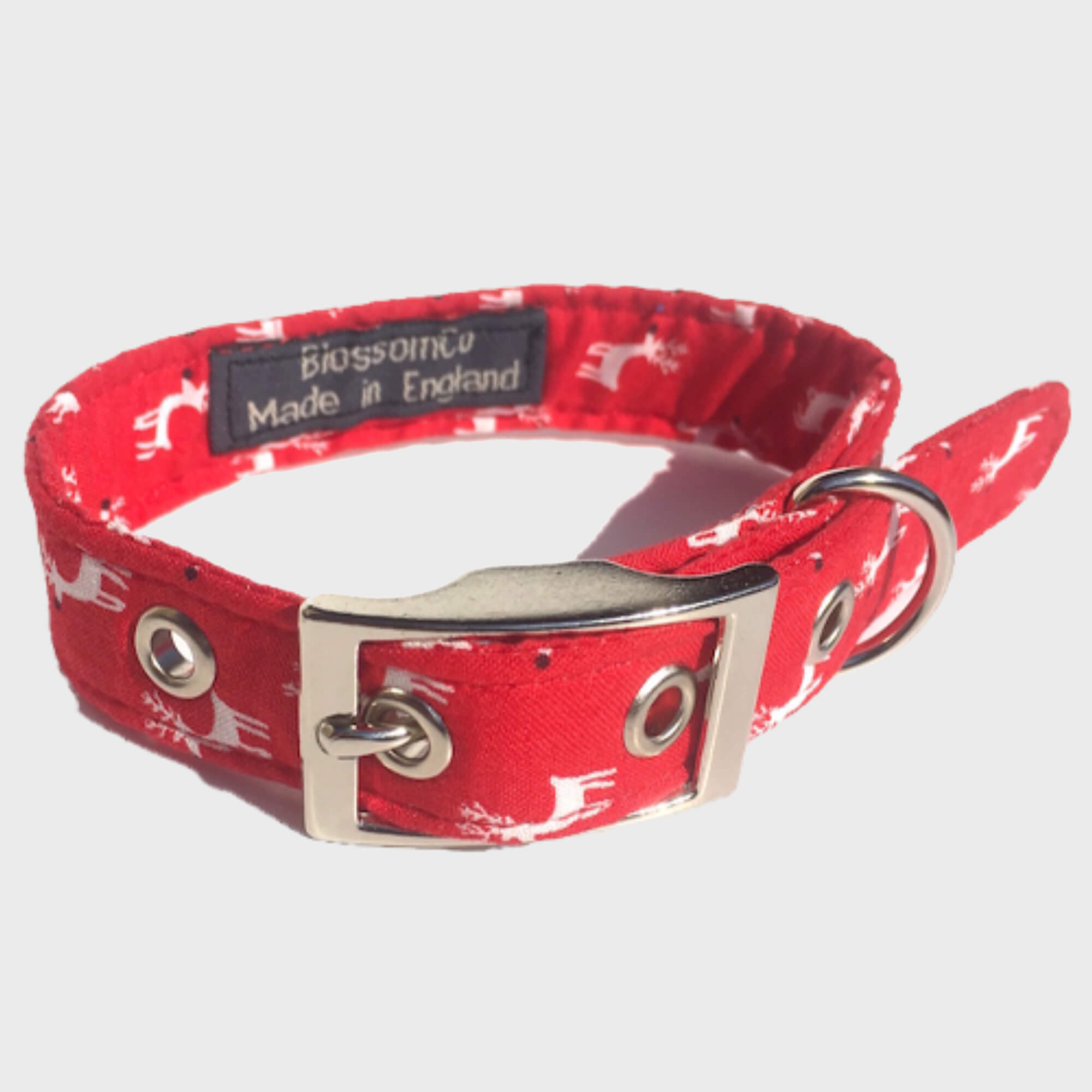 The Christmas Reindeer dog collar by BlossomCo is handmade in the UK with festive fabric and durable webbing. Designed for comfort and strength, it features a cheerful reindeer print that adds seasonal charm to your dog’s look. With sturdy fittings and quality craftsmanship, this collar is both practical and stylish for holiday walks.